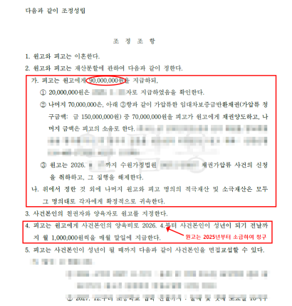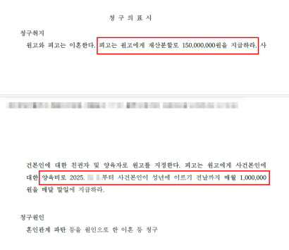 상대방은 재산분할로 1억 5천만 원을 청구하는 한편 양육비 역시 과거 시점부터 소급해 지급하라고 요구했습니다.
