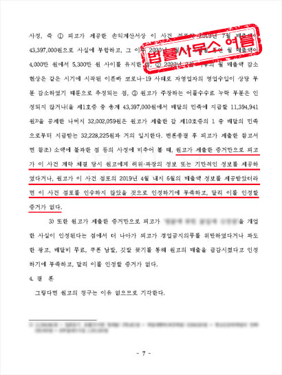 하지만 인수 직후 B는 “본사가 제공한 매출표가 허위이며,