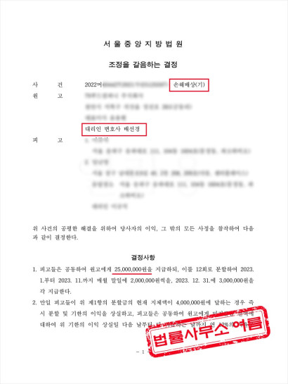 의뢰인 본사가 청구한 내용대로 부부 모두의 책임을 인정하는 조정조서가 성립되었습니다.
