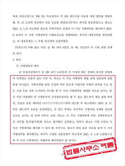그런데 B 가맹본부 대표 C는 “식품위생법상 시설 기준 미비로 가맹사업을 중단한다”는 문자와 이메일을 보내왔고,
