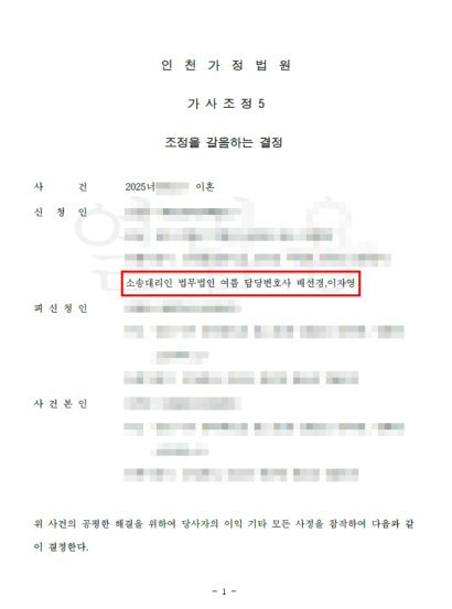 당사자 출석 없이 화해권고결정만으로 이혼을 확정한 사례들도 다수 진행해 왔습니다.
