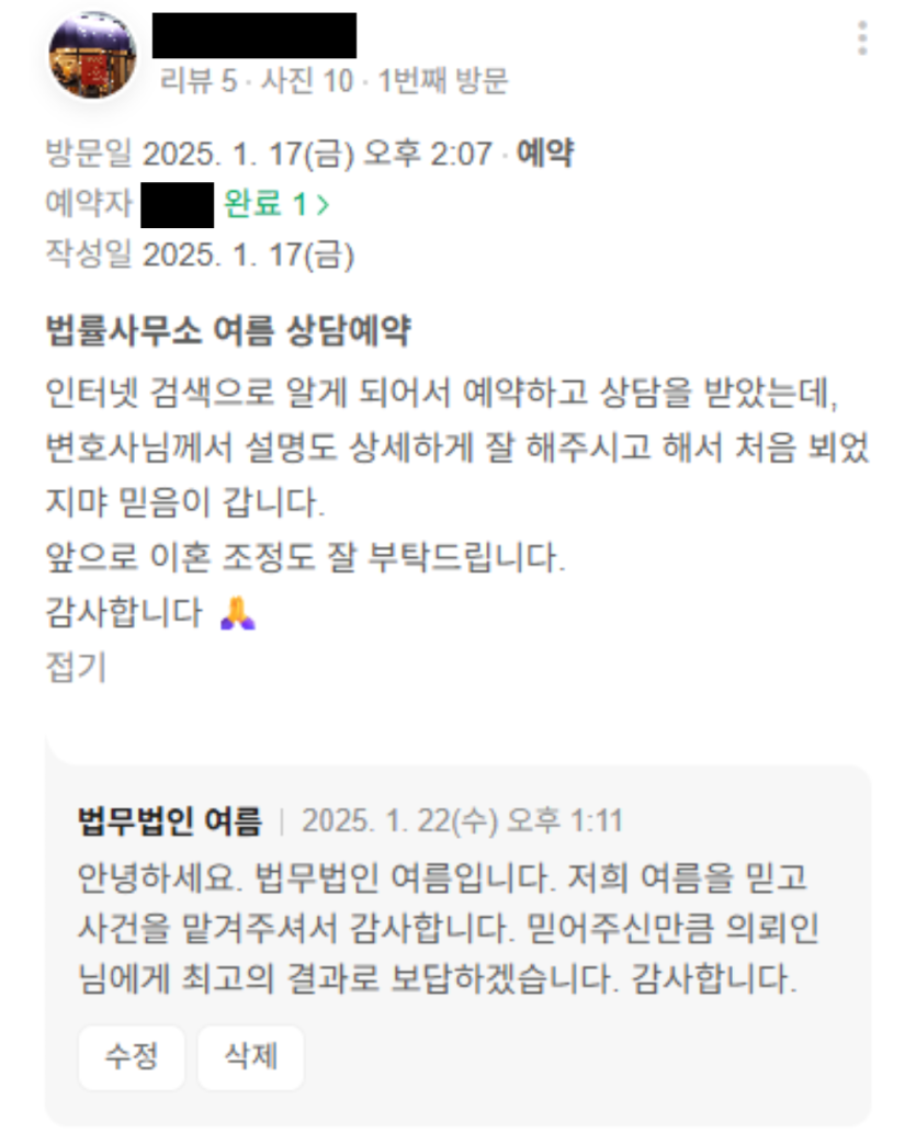 이혼 조정 상담 만족도 높아요 2025-11-12 인터넷 검색으로 알게 되어서 예약하고 상담을 받았는데,변호사님께서 설명도 상세하게 잘 해주시고 해서 처음 뵈었지만 믿음이 갑니다.앞으로 이혼 조정도 잘 부탁드립니다. 감사합니다. 사건담당배선경 변호사 사건담당이자영 변호사 목록