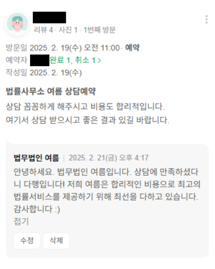 꼼꼼한 상담부터 합리적인 비용까지 전부 좋았어요 2025-11-12 상담 꼼꼼하게 해주시고 비용도 합리적입니다.여기서 상담 받으시고 좋은 결과 있길 바랍니다. 사건담당배선경 변호사 사건담당이자영 변호사 목록