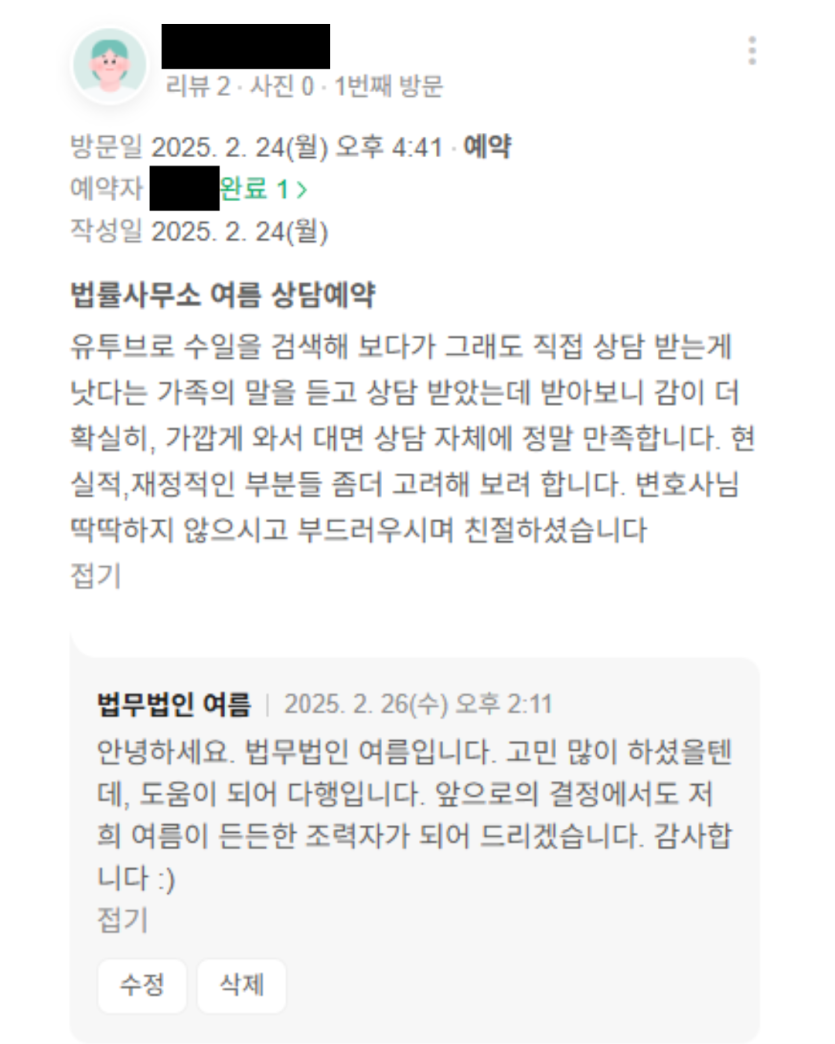 현실적, 재정적인 부분들 좀 더 고려해보려 합니다. 변호사님 딱딱하지 않으시고 부드러우시며 친절하셨습니다.