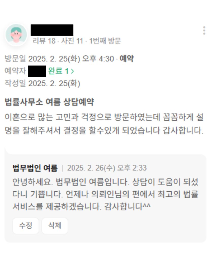 이혼 상담 너무 만족했어요 2025-11-12 이혼으로 많은 고민과 걱정으로 방문하였는데꼼꼼하게 설명을 잘해주셔서 결정을 할 수 있게 되었습니다. 감사합니다. 사건담당배선경 변호사 사건담당이자영 변호사 목록